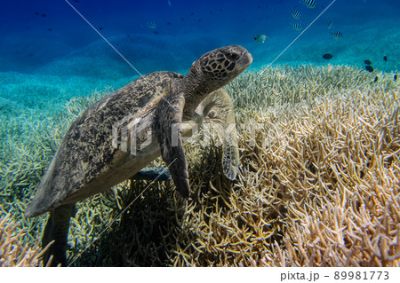 エダサンゴの上を泳ぐアオウミガメの水中写真