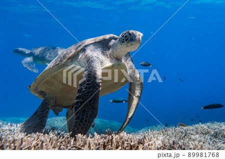 サンゴ礁の上を泳ぐアオウミガメの水中写真