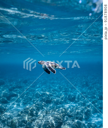 サンゴ礁の上を泳ぐウミガメの水中写真