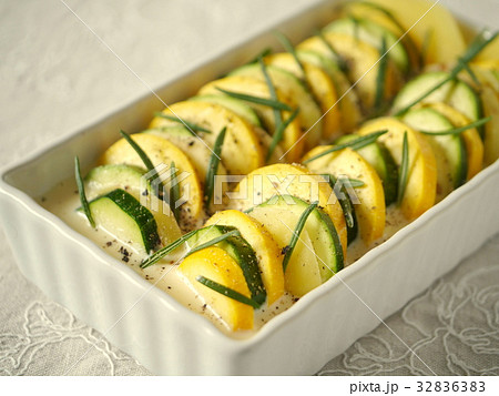 2色ズッキーニとジャガイモ、ローズマリーのフラン (横位置ハイアングル)