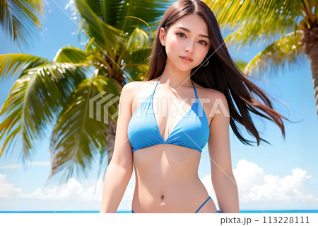 自然豊かな南の島の海岸。ヤシの木の下でポーズをするビキニの女の子