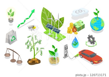 3D Isometric Flat Set of Sustainable Investment Elements, Ethical Business, Green and Environmental Goals