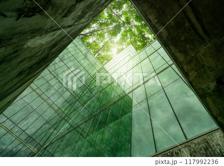 Eco-friendly building in modern city. Sustainable glass office structure with integrated greenery to reduce heat and carbon dioxide. Corporate architecture. Reducing CO2 emissions. Green environment.