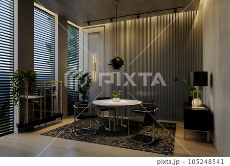 Modern dining room interior design contemporary, with natural tones on the room, walls, floor and ceiling. rendering illustration