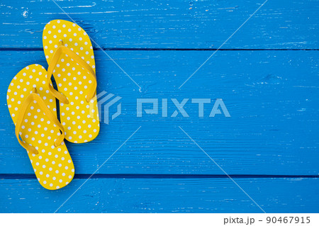 colored slippers on a blue and orange background, as if standing at the water's edge, the concept of summer holidays
