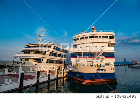 大津港に入港する学習船うみのこと停車中のビアンカ