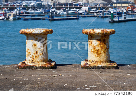 A heavily rusted samson post style single bitt mooring bollard for boats