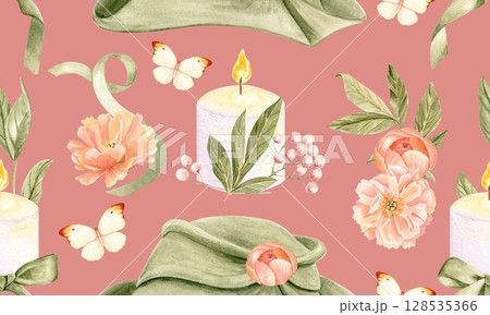 Burning candle, blooming peonies, green hat with soft folds, butterflies and berries watercolor seamless pattern on pink. Perfect for wedding invites, packaging, romantic decor and seasonal designs
