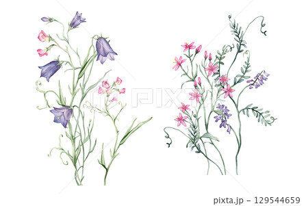 Watercolor floral composition illustration - wildflowers bouquet set. Summer meadow bluebell and pink flowers . Greetings, wallpapers, fashion, background texture, wrapping. Hand drawn illustration.