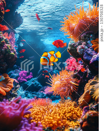A vibrant underwater scene featuring colorful coral reefs, various species of fish including clownfish, and anemones, showcasing the diversity and beauty of marine life.