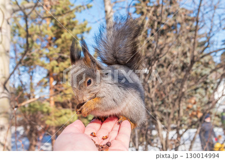 Squirrel eats nuts from a man's hand. Caring for animals in winter or autumn.