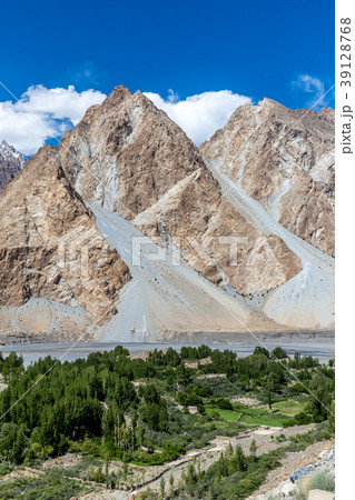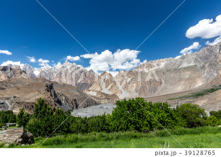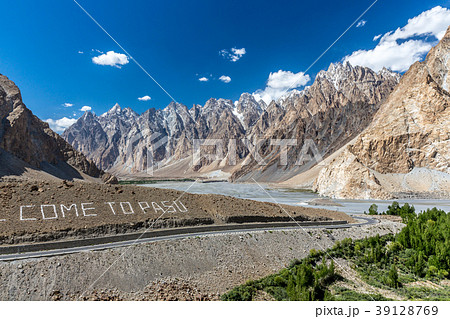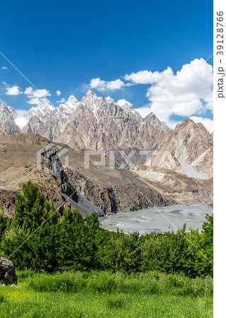 上部フンザのパスーカテドラル峰とフンザ川の美しい風景