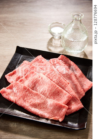 黒毛和牛の霜降りスライス肉を黒い角皿に美しく盛り付け、日本酒の徳利と盃を添えた高級感あふれる和食