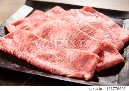 黒毛和牛の霜降りスライス肉を黒い角皿に美しく盛り付けたクローズアップ写真。艶やかな脂と繊細なサシ模様