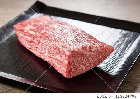 A5ランク黒毛和牛のもも肉ブロックを黒い角皿に盛り付けた高級感あふれる食材写真