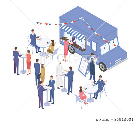 オフィス近くにあるお客が賑わっているキッチンカーのアイソメイラスト