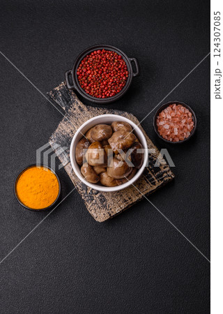 Grilled champignon mushrooms with salt, spices and herbs
