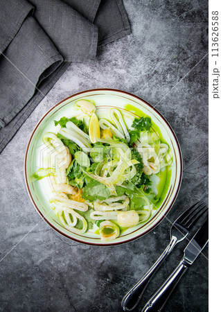Delicious Asian food udon with noodles, chicken, hot pepper, vegetables