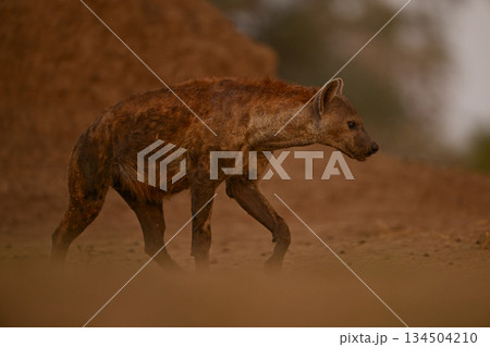 Spotted hyena passes termite mound lifting foot