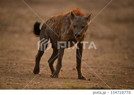Spotted hyena walks dribbling saliva from mouth