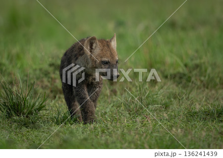Spotted hyena cub stands on grassy plain