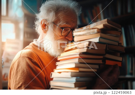 Elderly man enjoys new hobby with a stack of library books in cozy indoor setting