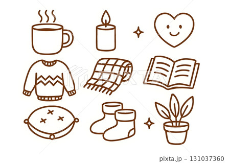 A cozy set of brown line art icons featuring a mug, candle, sweater, book, scarf, boots, pillow