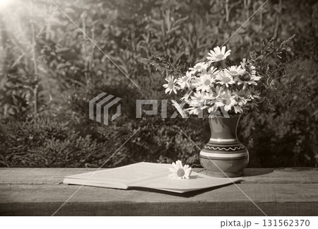 Bouquet of white flowers on top of a stack of books against an empty green-painted background