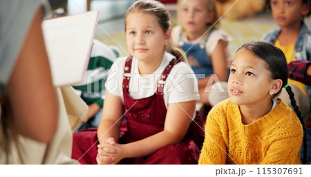 Kindergarten, story and teacher reading to children in montessori school, classroom and learning. Kids, fairytale and woman teaching language literacy in fantasy with creative preschool education