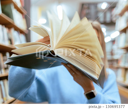 Education, book and pages in a library for reading for knowledge, learning or studying. Information, books and woman looking at paper in a novel or story at a book store to study, learn or read.
