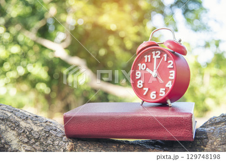 Alarm clock Red vintage retro time on book and tree green nature bokeh nature deadline concept.