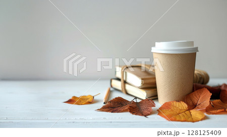 Autumn background with a takeaway coffee cup, fallen leaves, and vintage notebooks on a white wooden table with copy space. Cozy and minimal flat lay with warm seasonal atmosphere.