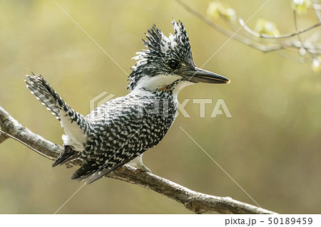 川辺の木の枝にとまるカワセミ科最大の鳥ヤマセミ