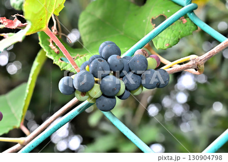 公園のフェンスに巻きついて実をつけた野生の葡萄、エビヅル