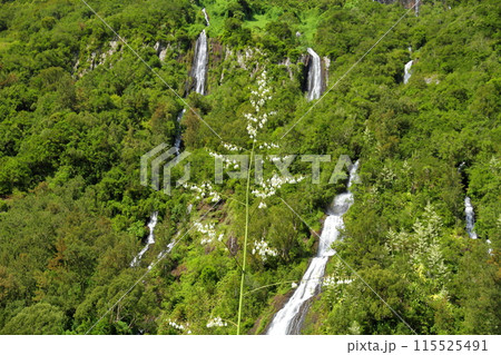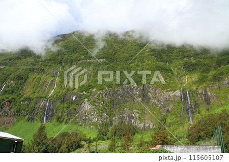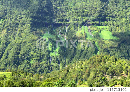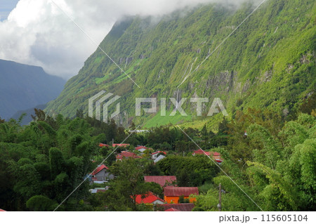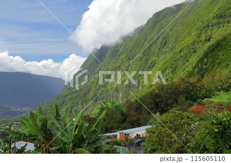 フランス海外県レユニオン島 世界遺産のサラジー圏谷の村エルブールから断崖絶壁を流れる滝の景色