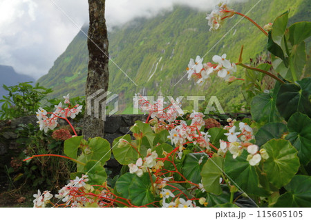 フランス海外県レユニオン島 世界遺産のサラジー圏谷の村エルブールから花と断崖絶壁を流れる滝の景色