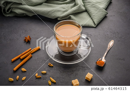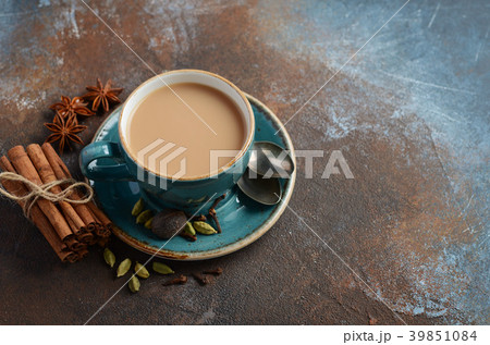 Traditional Indian masala tea chai. Cinnamon, anise, cardamom, sugar next to a black textured