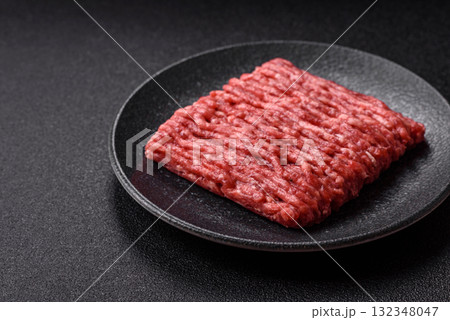 Raw minced beef or pork, ground meat for burgers. Raw minced meat