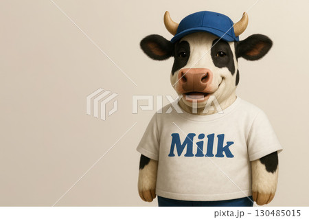 A cow wearing a T-shirt with the inscription Milk and a blue cap, on a light background. Space for text.