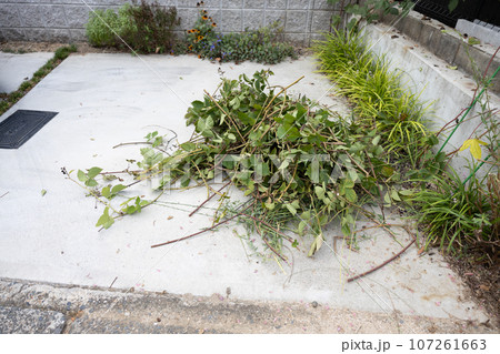 剪定して積み上げてあるブラックベリーの枝
