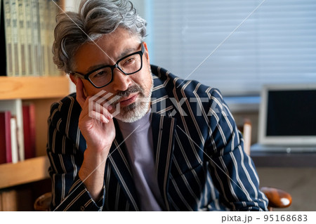 渋い ビジネスマン 英国紳士 エレガントな佇まい 書斎 接客 座る
