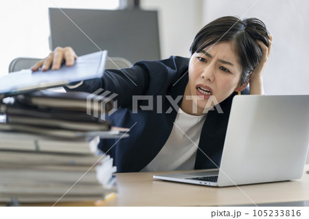 デスクワーク ノートパソコンの画面を見ながら考え込む若いビジネスウーマン