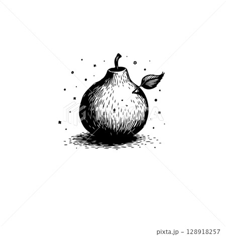 Elegant monochrome illustration of a pear with leaf detail on a white background