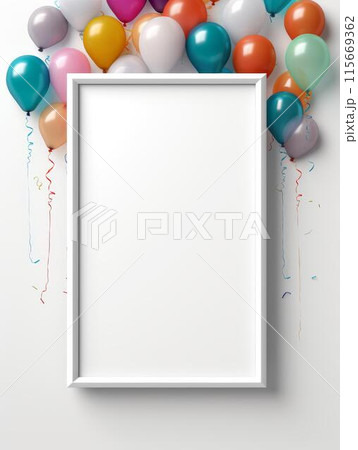 Generative AI An empty photo frame on a white background, with balloons on the edges