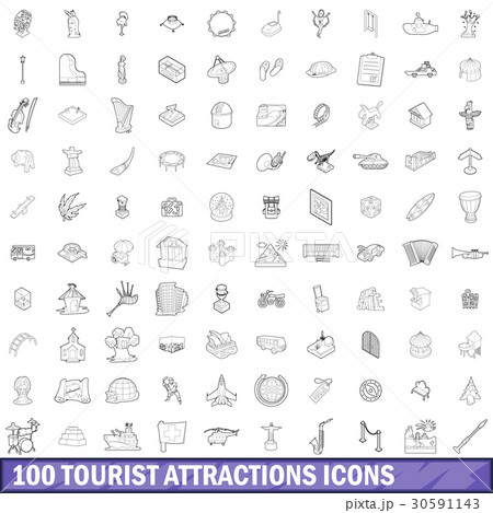 100 tourist attractions icons set, outline style