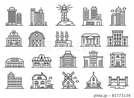 Building line icons, government house, factory, city office buildings. Residential and industrial architecture, urban buildings vector set