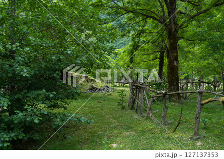 A village in Georgia with an old wooden fence. Mountains, cloudy sky