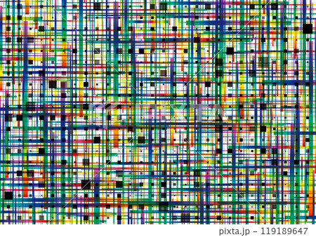 カラフルな縦横のラインの交差と黒いタイルの構成