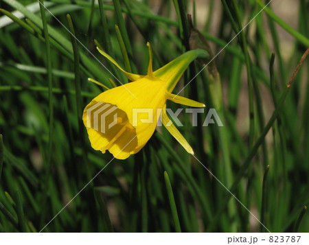 春の庭に咲く黄色い原種のペチコートスイセン(ナルシサス・バルボコディウム)の花