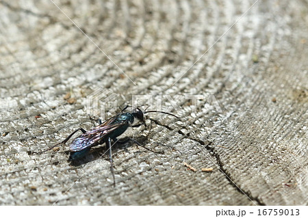 生き物 昆虫 ルリジガバチ、瑠璃色の金属光沢が美しいスマートなハチ。ヒメグモ等を幼虫の餌にします